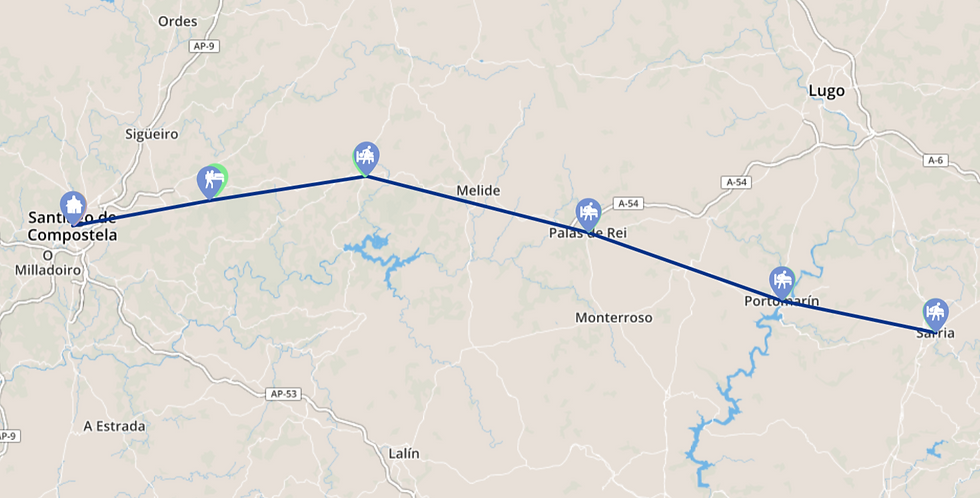 Para esta segunda práctica decidí elaborar un mapa del Camino de Santiago desde Sarria, ya que es una de las rutas más famosas del Camino Francés. Para ello, marqué un recorrido desde Sarria hasta Santiago de Compostela, mostrando también los lugares intermedios más habituales. A mayores aparecen albergues de la Xunta de Galicia en todos los puntos, exceptuando el fin de la ruta; la Catedral de Santiago y la Oficina de Acogida al Peregrino.