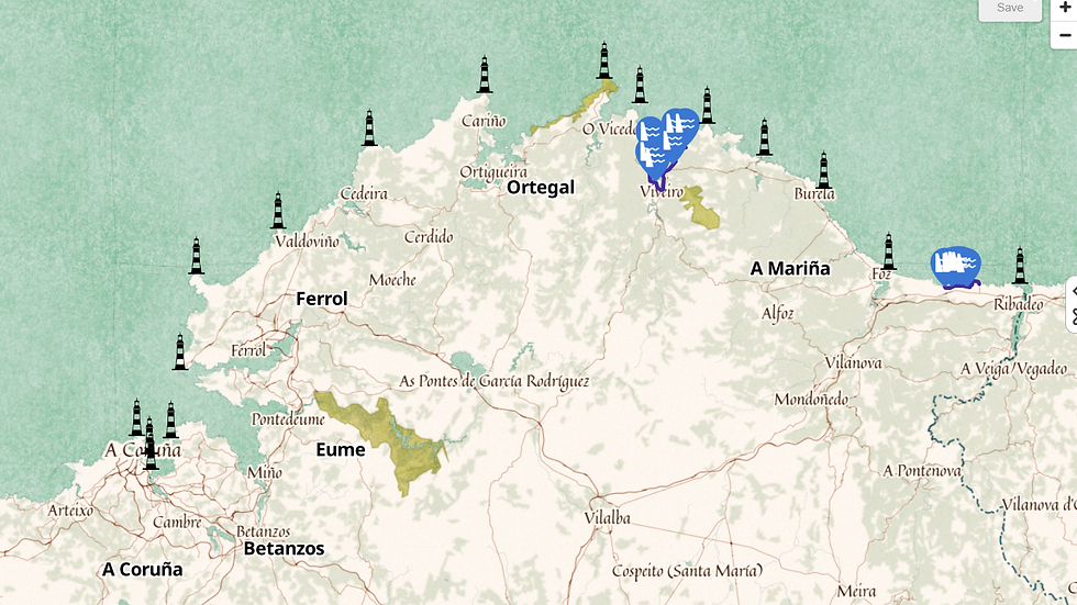 Este mapa contén os faros da costa norte galega e trata de levantar interese en visitalos engadindo dúas rutas polas praias que rodean a algúns faros. A elección do mapa base é o de temática pirata xa que vai acorde co asunto marítimo e lle dá unha visión máis fantástica e atractiva.