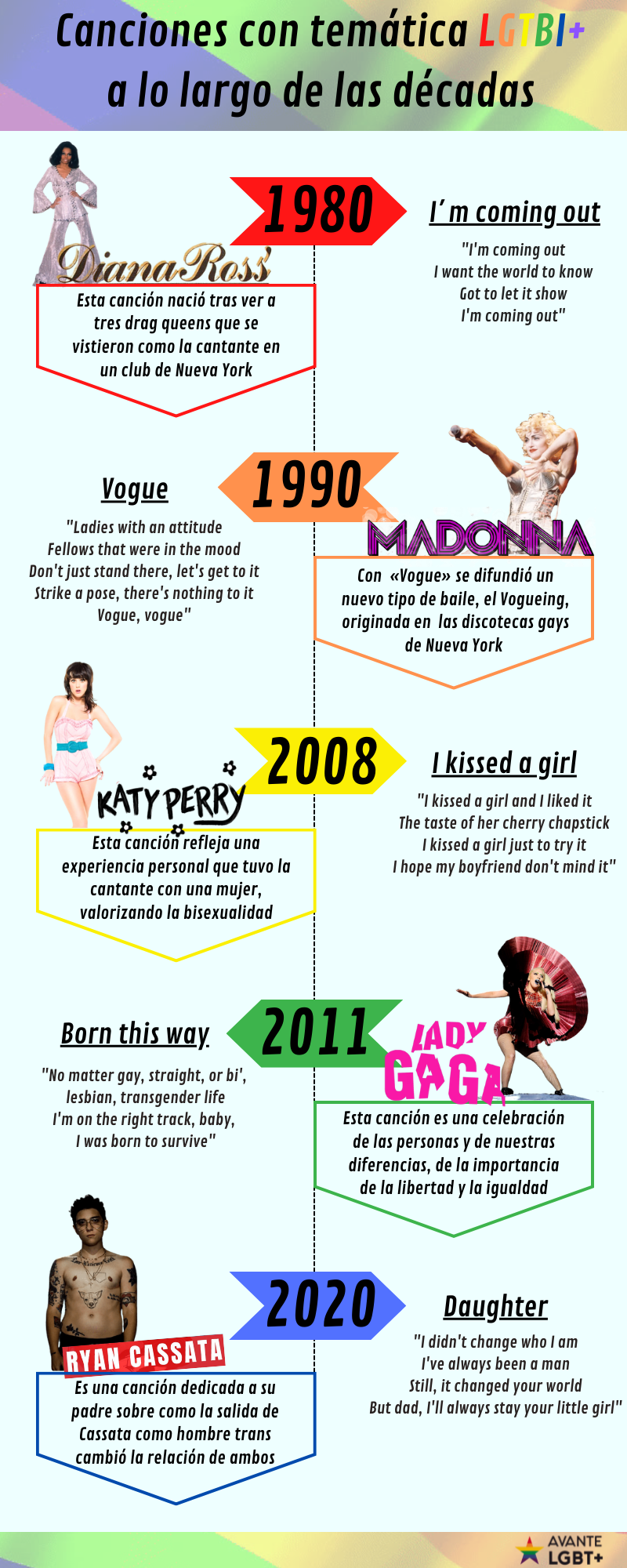 Para esta infografía he querido ponerme en la piel de una asociación de apoyo a la Comunidad LGTBIQ+, poniendo como ejemplo AVANTE LGBT+, para tratar de representar las canciones más populares en lo referido a temática LGTBIQ+.
