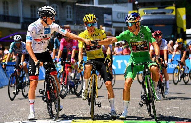 Pogacar, Vingegaard y van Aert portando sus respectivos maillots de líderes en el pasado Tour de Francia. Imagen: TdF