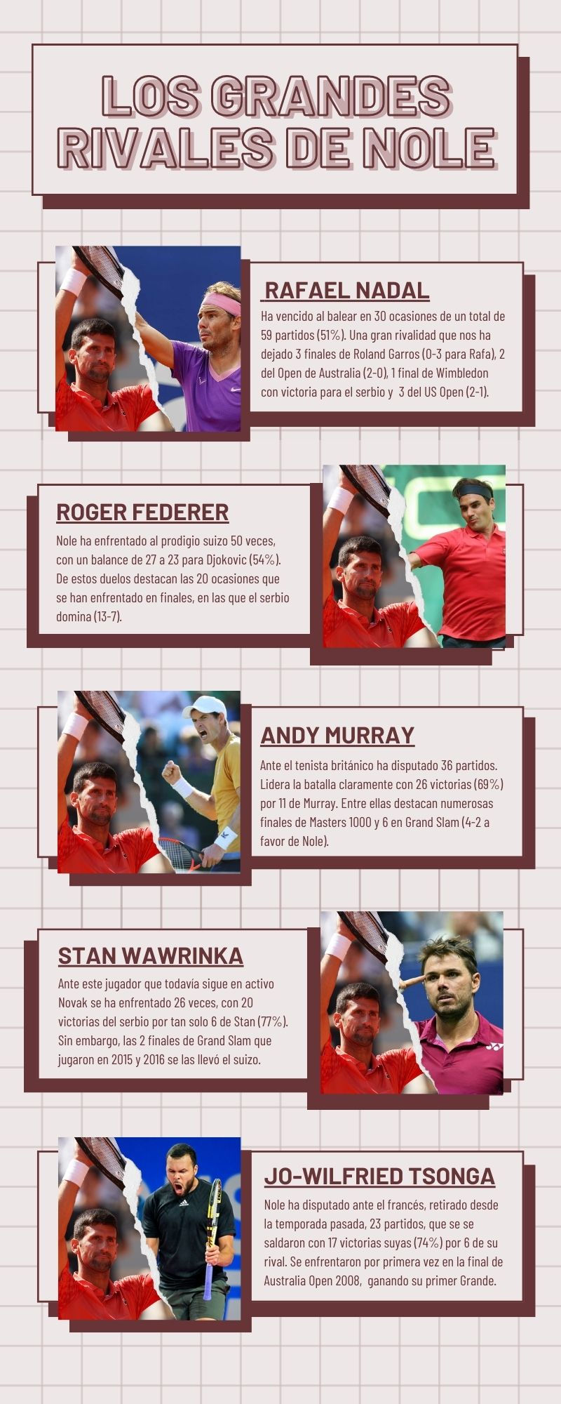 A la sombra de los grandiosos e idolatrados Rafael Nadal y Roger Federer se ha ido forjando una mentalidad de hierro que, sumada a su talento, ha terminado por desbancar los récords de ambas “instituciones del deporte” hasta llegar al punto de minarles la moral después de importantes victorias en la pasada década. Pese a que en sus comienzos jugar contra alguno de ellos era peor que un dolor de muelas para Nole, ha conseguido revertir la situación hasta el punto de estar por encima de ellos en victorias en enfrentamientos directos. También supera en récord a todos los grandes jugadores de la generación dorada de este deporte.
