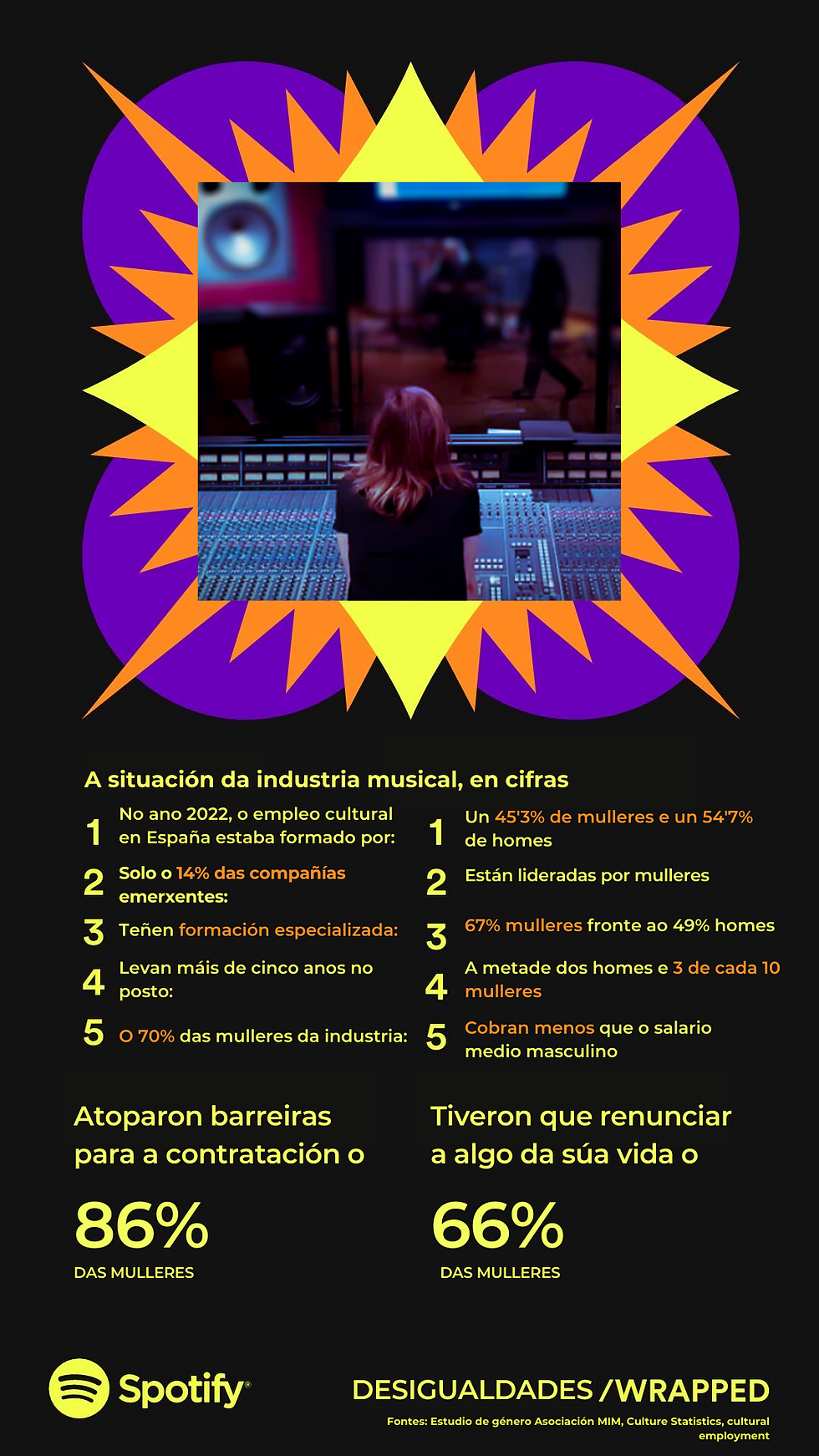 A presenza de artistas femininas sobre o escenario non é probablemente chamativa para ninguén, pois levamos décadas vendo a múltiples mulleres ser iconos da música, tanto nacional coma internacional. É doado que esta representación leve a unha falsa sensación de paridade conseguida fai anos, máis esto non é así. Se nos paramos a reflexionar, probablemente todos poidamos dicir rapidamente nomes de vocalistas e intérpretes, mais non é tan sinxelo para moita xente nomear a unha guitarrista, batería ou demais instrumentistas.