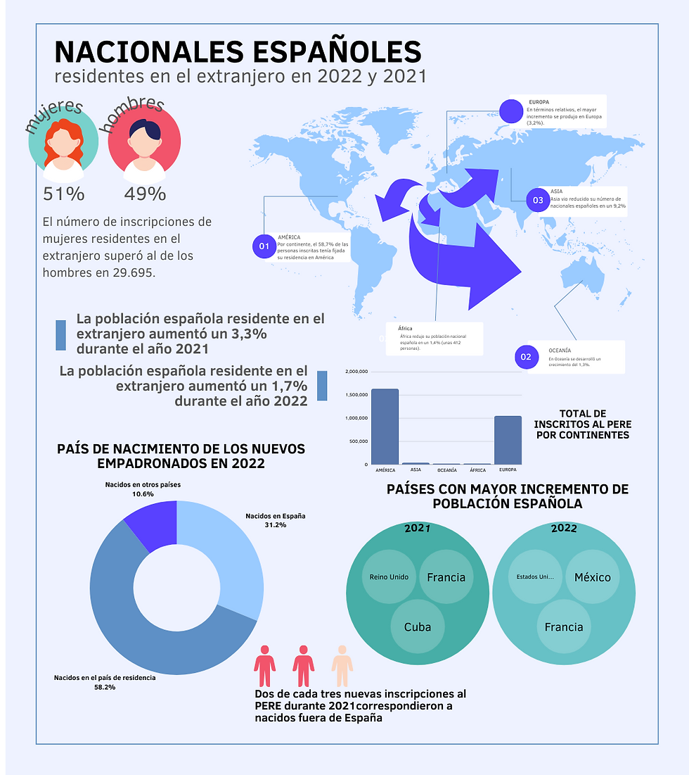La última estadística del Padrón de Españoles Residentes en el Extranjero (PERE), realizada cada año, proporciona una ventana muy útil para entender la evolución de la diáspora española en los últimos años. No solo ofrece una información valiosa en cuanto a flujos migratorios de los españoles, sino que también es un reflejo de nuestro pasado histórico y nuestra situación geopolítica. En él, se observan tendencias notables y cambios en la distribución geográfica, composición demográfica y comportamiento migratorio de los ciudadanos de España en el extranjero.