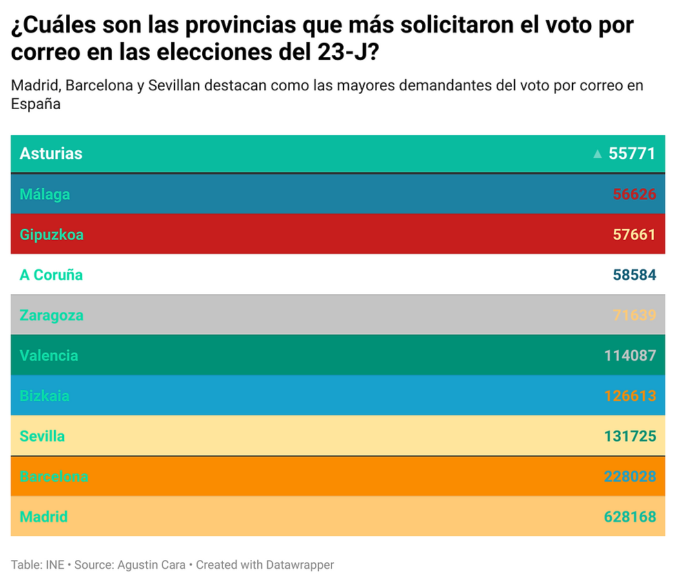 Para el mapa, decidí destacar a Madrid como la Comunidad Autónoma con mayor número de votos por correo, con el color más llamativo posible. Los tonos más claros los utilicé para resaltar las comunidades con menor porcentaje de electores.