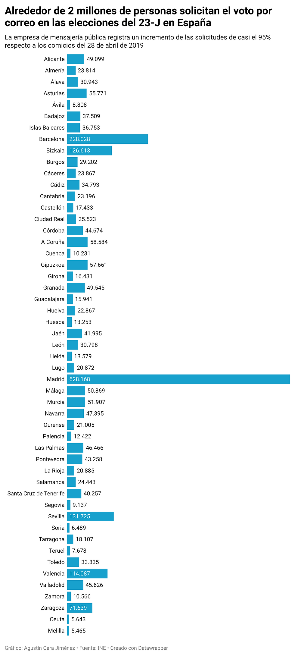 Para esta práctica decide analizar el voto por correo en las elecciones del 23J en todas las provincias españolas. Para ello, cogí los datos del Instituto Nacional de Estadística referente al número de votos por provincia.