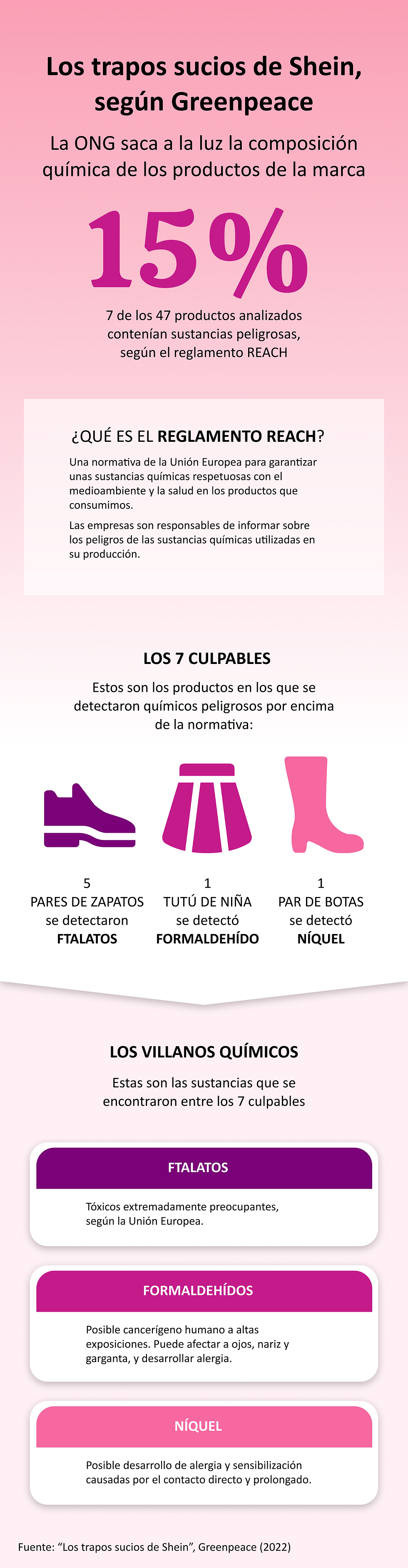 Frente a estos datos tan alarmantes, la ONG Greenpeace elaboró un informe en 2022 en el que analizaba varios productos de Shein, con la conclusión de que varios de ellos contenían niveles de sustancias químicas peligrosas por encima de los índices establecidos por la Unión Europea (reglamento REACH). Dicho de otra forma, está comprobado que la marca china comercializa con prendas de ropa que son ilegales en Europa sin cumplir, además, con la normativa de transparencia por la que la marca debería informar a la población del uso de determinados químicos. Una completa ilegalidad que no sólo pone en riesgo nuestro planeta, con el uso de materiales sumamente contaminantes, sino también nuestra salud.