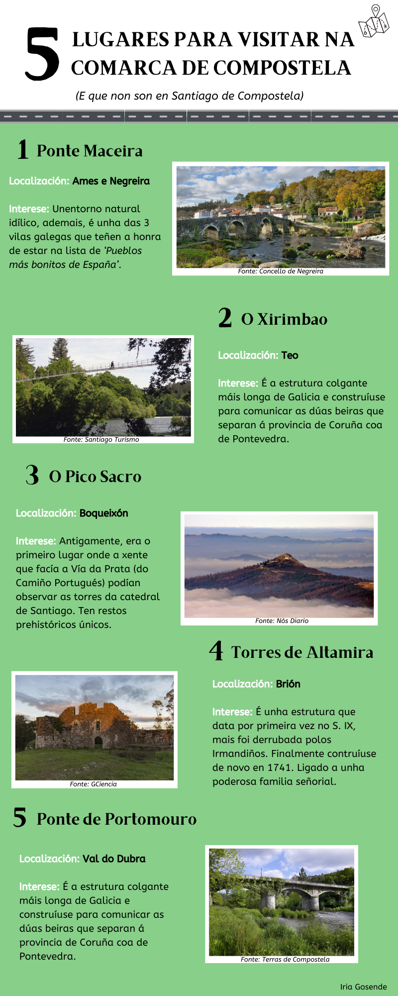 Neste primeiro traballo pensei en dar visibilidade ao resto de lugares da comarca de Santiago xa que habitualmente, todo o foco do turismo está acaparado pola capital galega. Escoller os sitios que quería poñer non me foi moi complicado, xa que son os sitios máis coñecidos da contorna polo que non tiven que investigar moito. Diría que a parte máis complicada do traballo foi non cargar moito o texto e colocar todos os elementos sen saturar a infografía. Houbo nalgún momento que se me complicou un pouco intentar que me colleran todos os elementos que quería incluír mais, finalmente, creo que conseguín poñer todo sen que quedara unha sensación de 'exceso'.